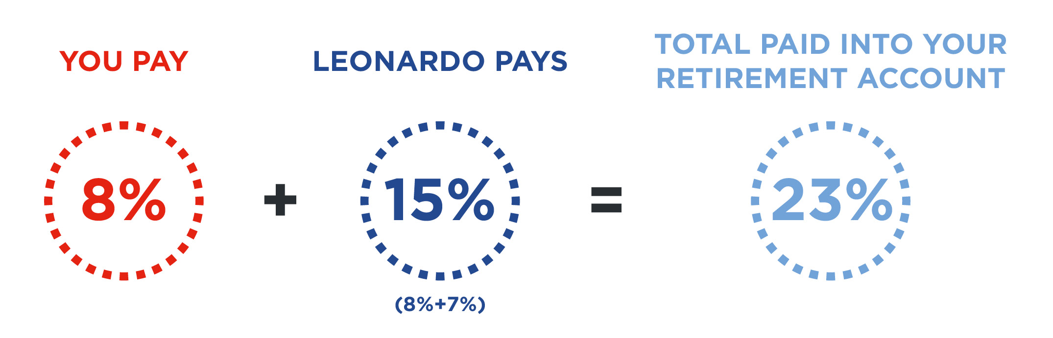 What you pay in is up to you. The more you decide to pay, the higher your Match Plus contribution boost will be (up to a maximum of 15%). To get the maximum Match Plus contribution from Leonardo, you’ll need to pay in 8% of your Pensionable Salary. The Company will match your 8% plus add a further 7% bringing the total from Leonardo to 15%.